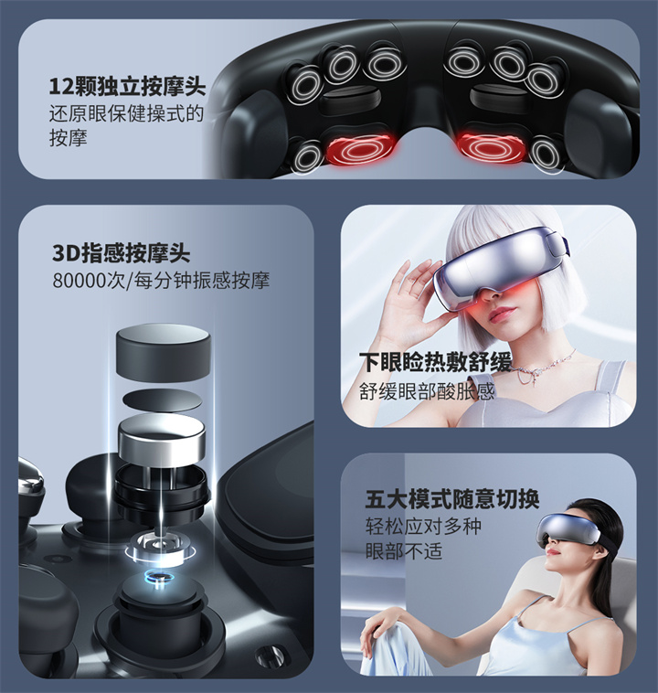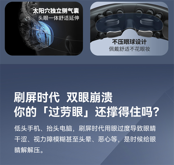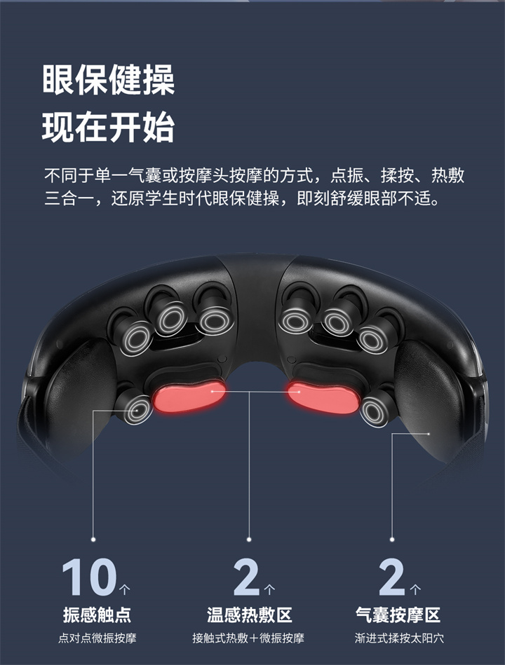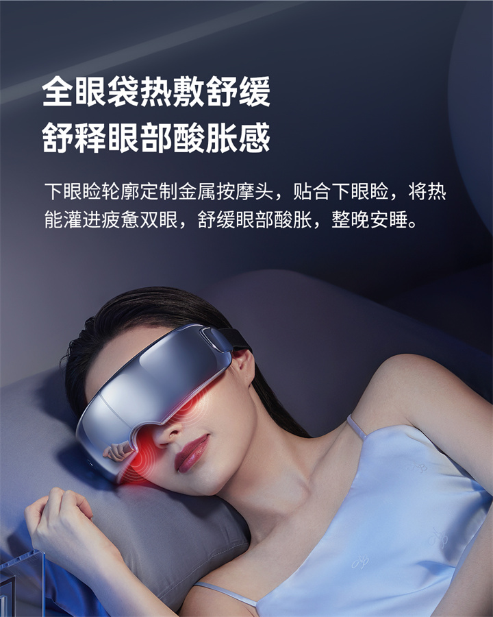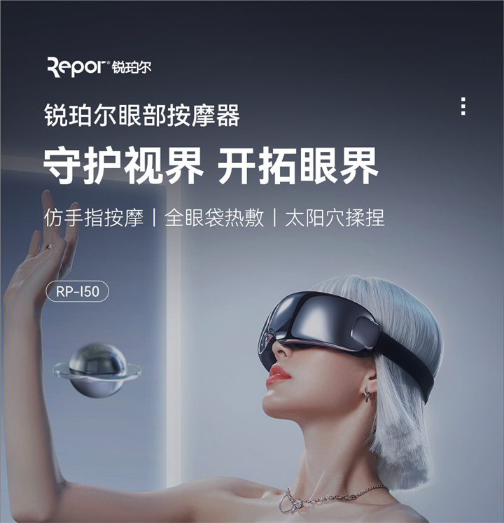 锐珀尔眼部按摩器RP-I50,根据国人眼型设计,机身弧度更贴合眼眶,贴心预留立体凹槽,保护眼球,按摩后视力不模糊,自带应急可视窗,可舒缓全黑密闭焦虑感;内置大自然的场景音效,让眼睛和心灵双重放松,还有蓝牙连接,可以随心听歌、听书等,更多神奇功能,等待您亲自试戴发现……